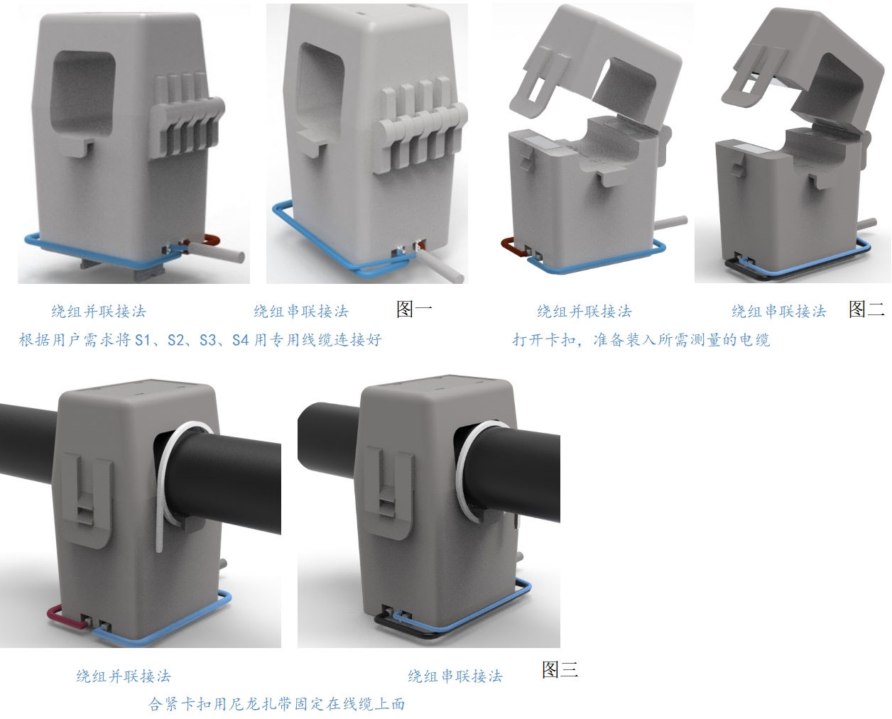 4.将被测电缆放置互感器孔内上。确认电缆电流方向与互感器标识箭头方向一致。将互感器卡扣重新锁住,使被测电缆在互感器中心孔内,并用尼龙扎带将互感器两端挂钩与被测电缆固定防止滑动。(见图三)