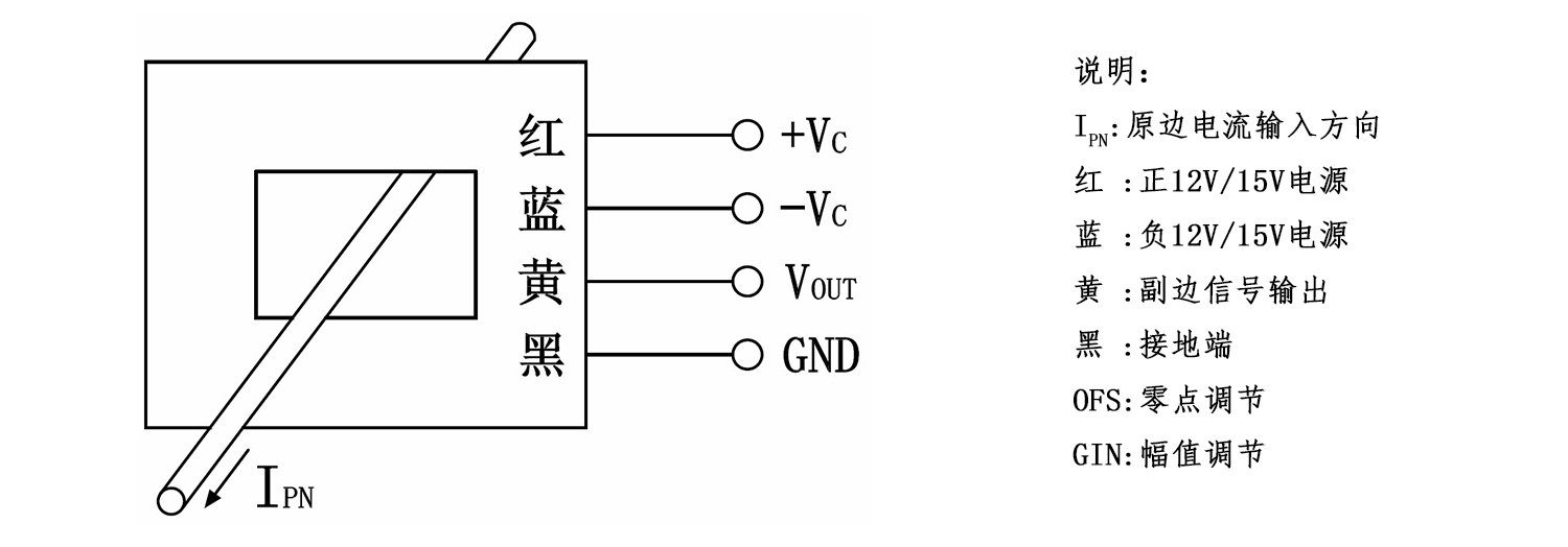 该传感器采用直测式霍尔检测原理工作。原边电流产生的磁通量聚集在磁电路中,并由霍尔器件检测出霍尔电压信号,经过放大器放大,该电压信号精准的反应原边电流。